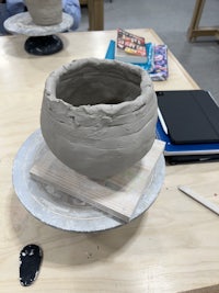 To start, I rolled out a slab for the base and I used a circle cookie-cutter to cut it. After that I started by adding 3 coils and then blending them. I built it up to the top and then i smoothed it out using the rubber rings and then paddled it. I created the lid by rolling out a slab and then putting it over a bowl to hold the shape. I put a coil on the outside. To add the clover, I printed out a stencil and traced it out of a slab.