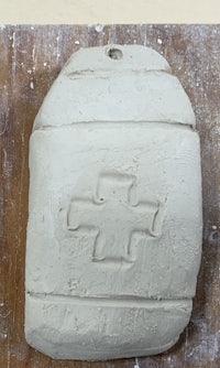 I started off with a round piece of clay and I added a top piece. I then flattened the back out. After that I added coils and the cross. Because it looked too bulky I decided to make some changes. I shortened it by cutting the top off with a knife. I then smoothed it out with a wooden modeling tool. I redid the cross by drawing it in with a pen over plastic wrap. I then used a needle to add the coils and the whole at the top and that was it.