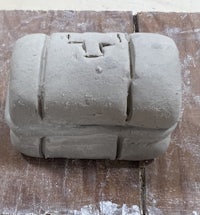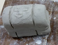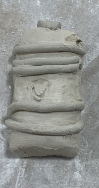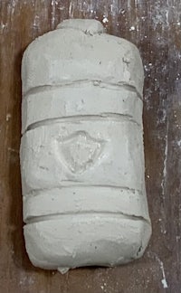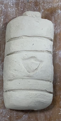 I started off with a round cylinder. I added coils and added the top part. I decided that it was too bulky so I took the coils off and i carved them in instead. I then smoothed it and redid the coils with a needle and added the shield using a pen and plastic wrap. After adding the details I smoothed it with a. Wooden smoothing tool. To paint this one, I painted the entire piece gray and then painted the shield blue. The technique I was dry brushing.