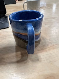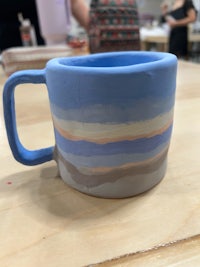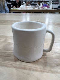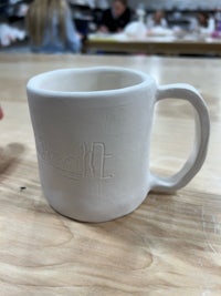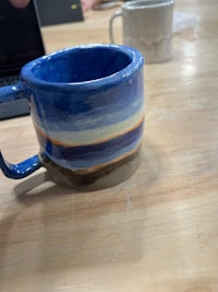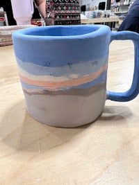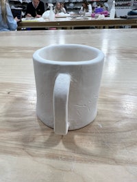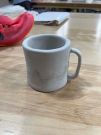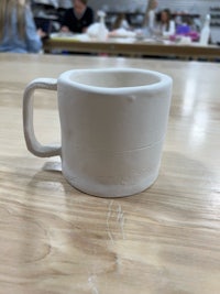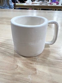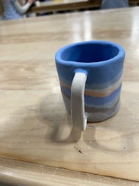 To make the mugs, I rolled a small slab that was three rulers thick and I cut a circle out of it for the base. To make the sides of them I rolled out a long slab that was two rulers thick and I cut them into rectangles about 5 inches by 11 inches. I scored and slipped them onto the base. To put the two sides together, I cut the two sides diagonally and then scored and slipped. I cut about an inch off the top to make them the right height and then blended everything together. I smoothed out the outside and the inside and then carved out a little bit on the bottom. To make the handle, I made a long and thin slab and then cut it to the right length and width. I scored and slipped the mug and the handle together and wrapped it with a wet paper towel. I didn’t really face any issues with construction and the only problem that I had was the handle cracking where it was connected to the mug. To fix this, I used magic slip and then wrapped it with a wet paper towel and sprayed it every day.