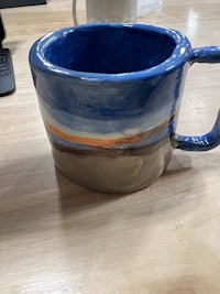For the first mug, I started off by glazing it with brown and taupe for the sand and the rocks. I then did the sunset with orange yellow and white. For the sky I used medium and dark blue.
